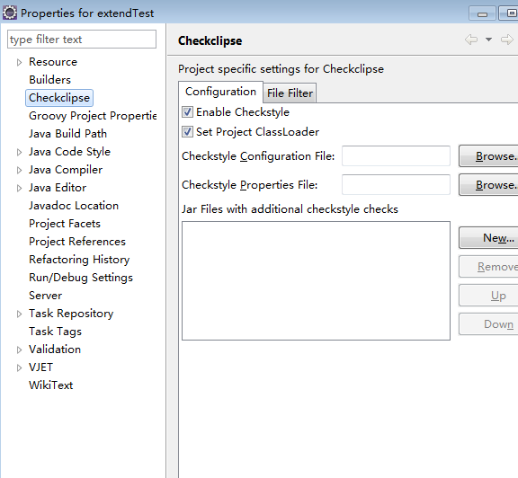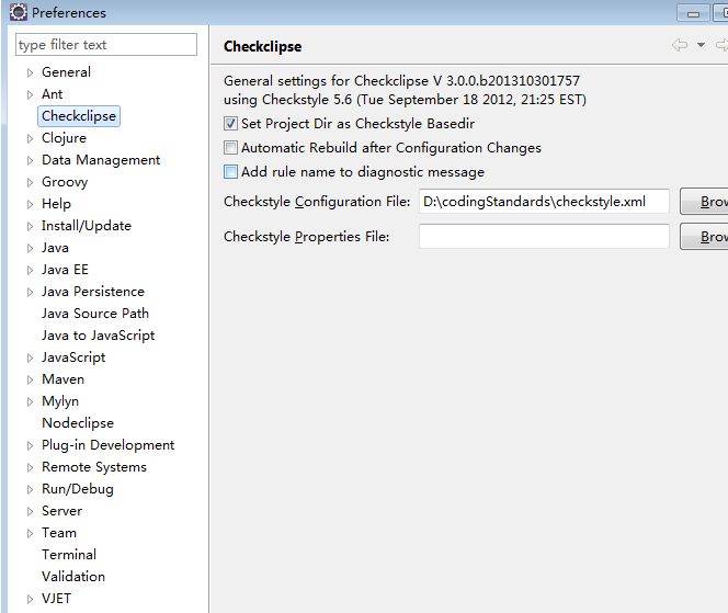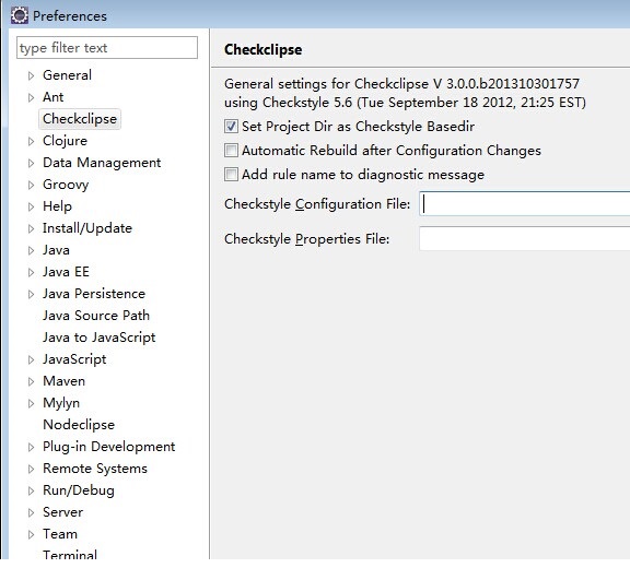 这里我通过Help->Software Updates->Find and Insta方式安装了好几次没有成功,最终选择下载插件jar包方式安装,我下载的是上面链接打开后列表中的de.mvmsoft.checkclipse_3.0.0.b201310301757.jar,下载后将jar包放到Eclipse安装目录plugins目录下,重新启动Eclipse在Windows—>preferences下找到checkclipse,如图: