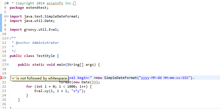 c、ok,可以进行Java代码编写了,此时如果没有按照checkStyle.xml里配置的规范要求编写代码,Eclipse中将给出错误提示: