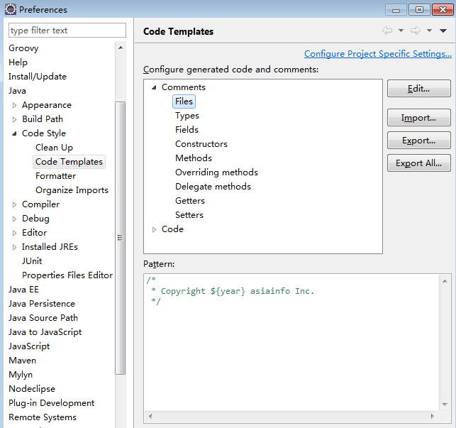 1、在Windows->preferences->Java->Code Style->Code Templates下新增文件默认生成模板: