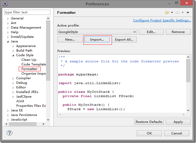 2、配置eclipse-java-google-style.xml到Eclipse中