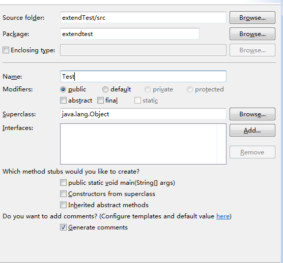 2、新建Java类时选择Generater comments