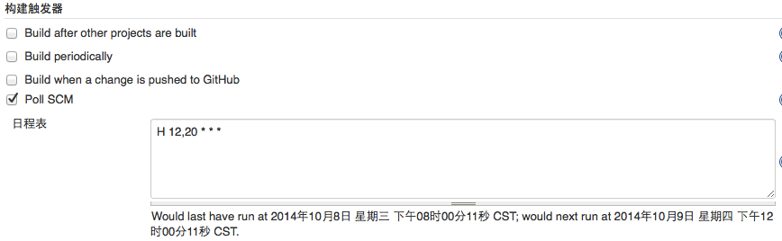- 填写触发条件,此处为每天的12时和20时触发,