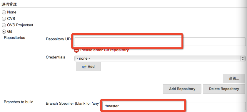 /home/git/blogtestgit;第二个框填构建的分支,一般为master,可以直接填master也可以像下图所示填写: