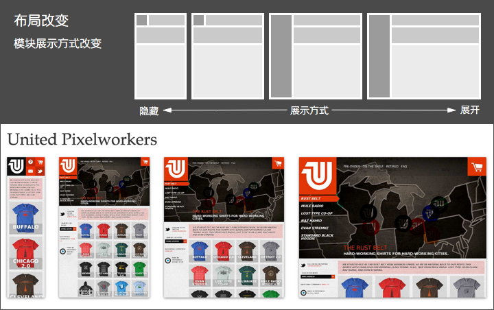 - 可切换的固定布局:同样以像素作为页面单位,参考主流设备尺寸,设计几套不同宽度的布局。通过设别的屏幕尺寸或浏览器宽度,选择最合适的那套宽度布局;