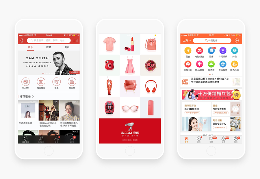 体验不同领域的APP,建立不同领域对APP色彩组合的选择,为后期项目设计奠定基础。根据主色进行分类,如红色系列:网易云音乐、京东、网易严选、网易考拉等等;也可以根据产品气质分类,如文艺、时尚、科技、可爱等等。