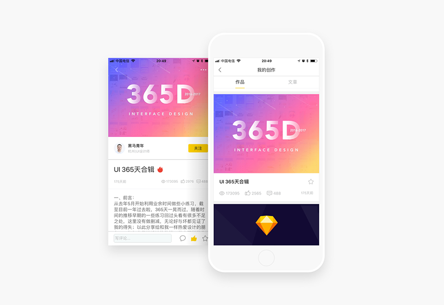 4:3 的图片比例可以使图像更紧凑,更易构图,方便设计师发挥。由于手机屏幕容量较小,作为全屏展示时,该比例在App设计布局上面占用空间较大。作为设计师来说,这个比例经常接触,站酷、UI中国的作品封面、Dribbble作品展示等都采用这个比例。