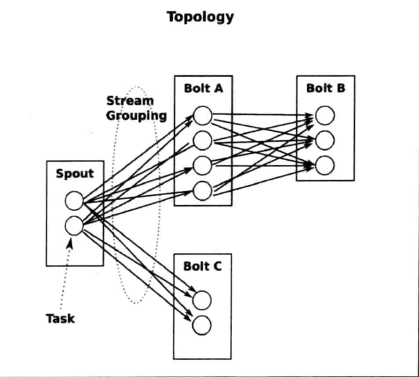Topology(拓扑):通过Stream Groupings将Spouts和Bolts连接起来构成一个Topology,是Storm中实时应用的一种封装。一个Topology会一直执行,无数据流等待,有数据流执行,知道被kill progress。