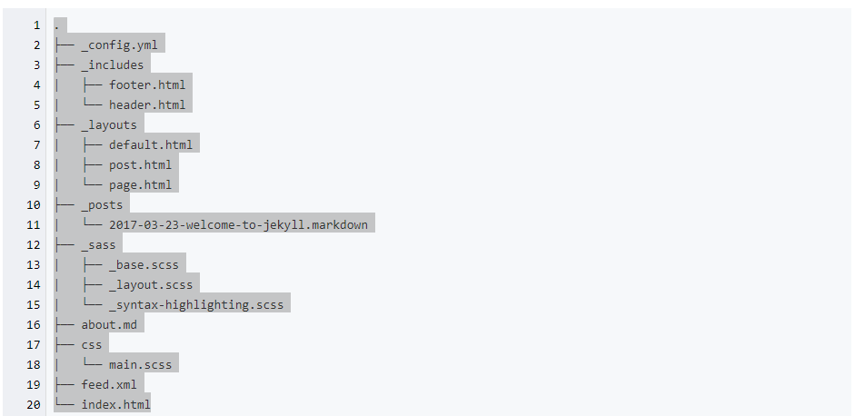 一个基本的 Jekyll 网站的目录结构一般是像这样的: