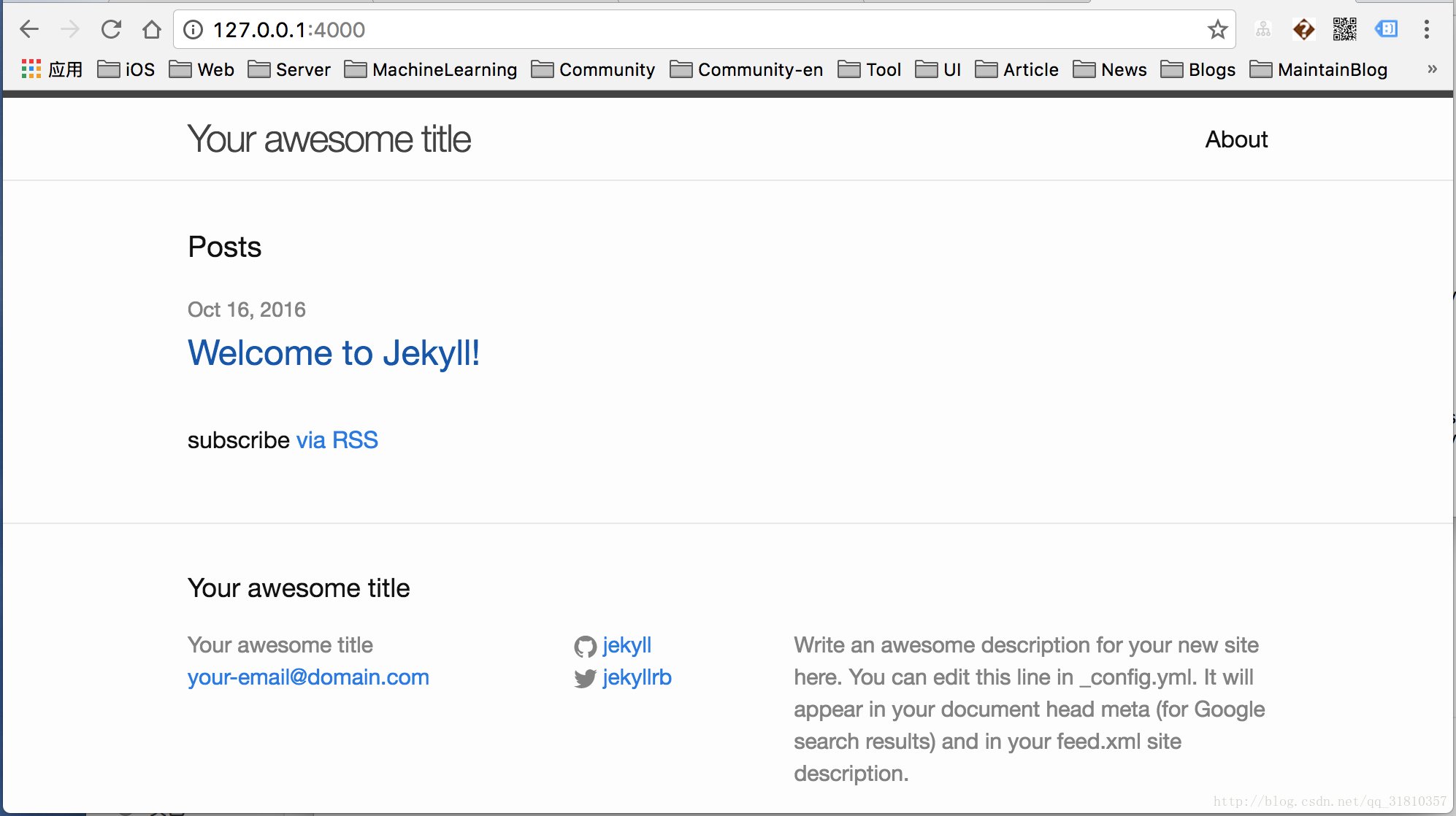 在浏览器里输入: http://localhost:4000,就可以看到你的博客效果了。