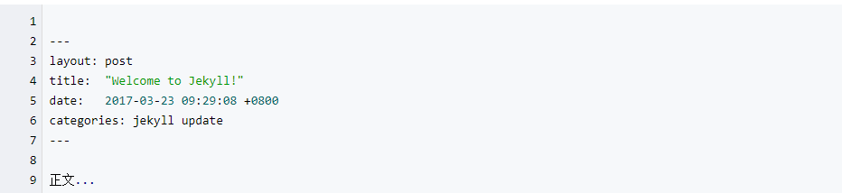 title: 显示的文章名, 如:title: 我的第一篇文章 date: 显示的文章发布日期,如:date: 2017-03-23 categories: tag标签的分类,如:categories: 随笔