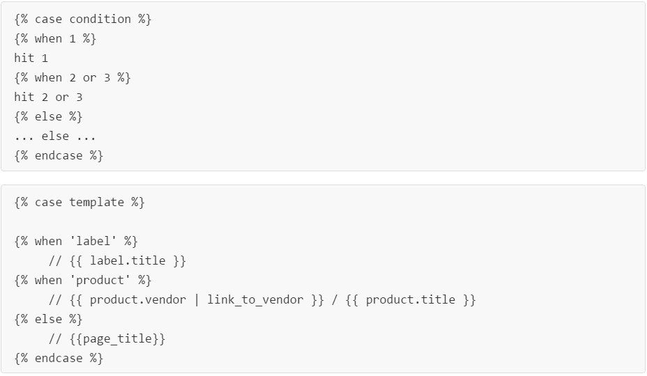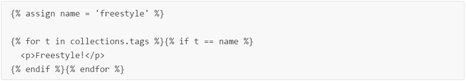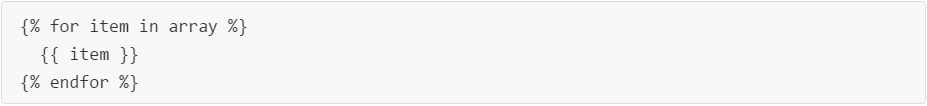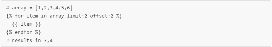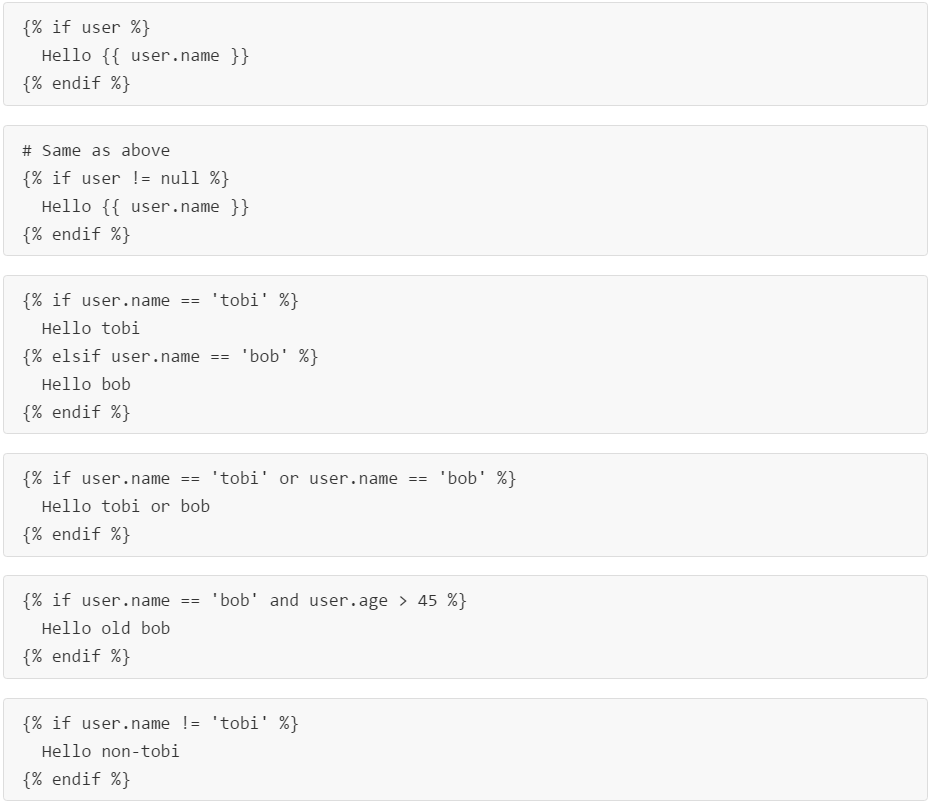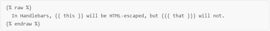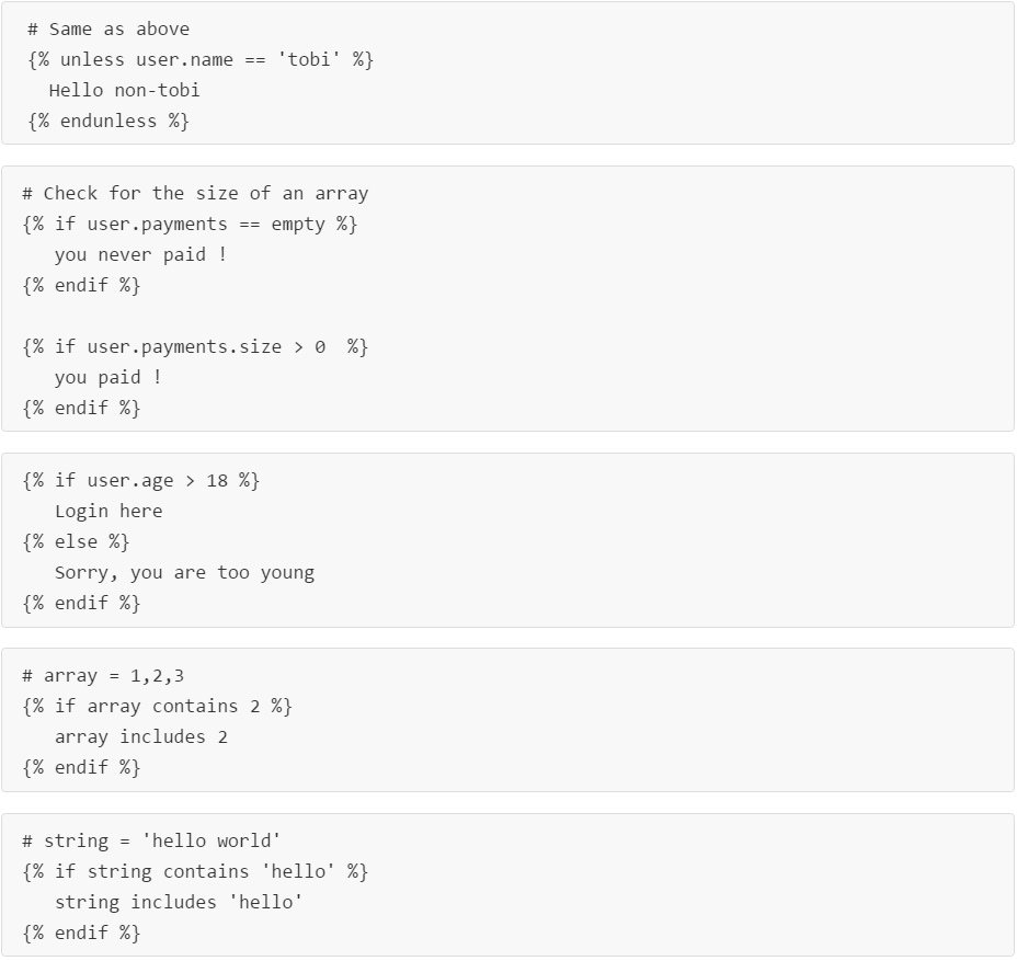 assign- 定义变量 e.g. `` 定义了变量tt数值为1capture-Block tag为变量赋值 e.g.`` 将tt的值赋给dontcase-Block tagits the standard case…when blockcomment-Block tag注释cycle- Cycle is usually used within a loop to alternate between values, like colors or DOM classes.for- for循环blockif- 判断blockinclude- 引入模板raw- 转义内容tage.g.{{ this }} #=> ''unless- Mirror of if statement